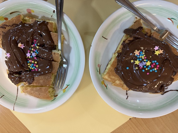 今日はバレンタインデーです♡おやつはチョコでコーテイングしたホットケーキです♡