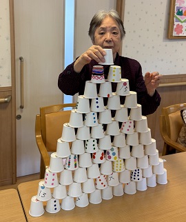 今日のレクリエーションは紙コップタワーです!
